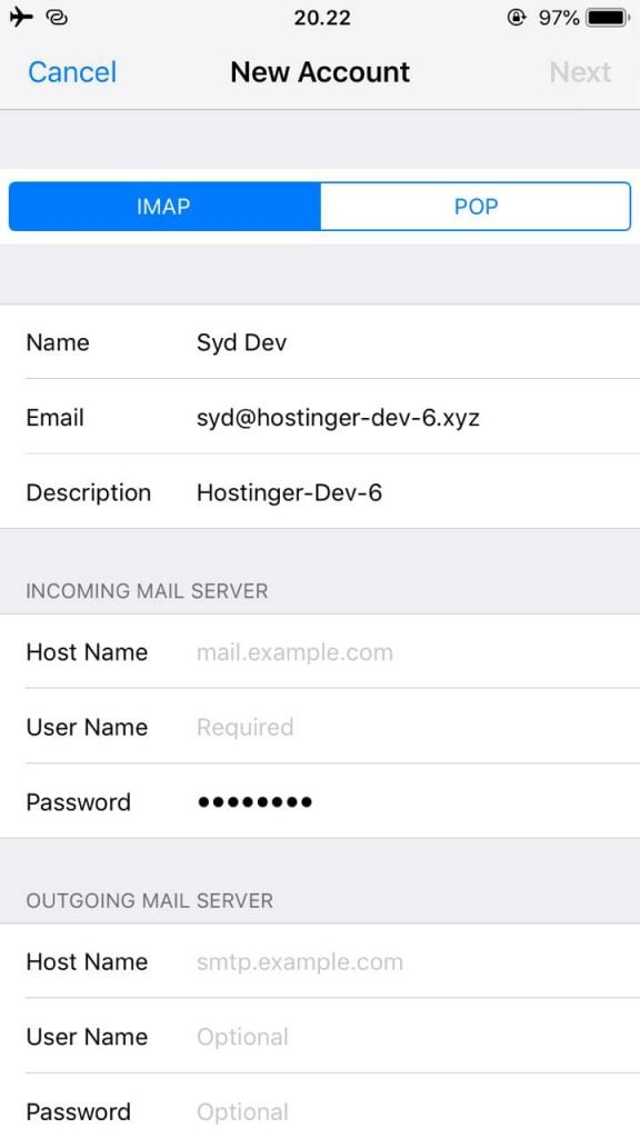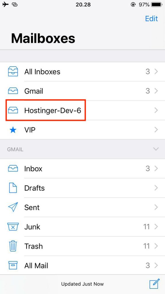 - Settings (Ayarlar) -> Passwords & Accounts (Şifreler ve Hesaplar) kısmına geri dönün. Oluşturduğunuz hesabın adını göreceksiniz. Bizim örneğimizde ise bu Hostinger-Dev-6.